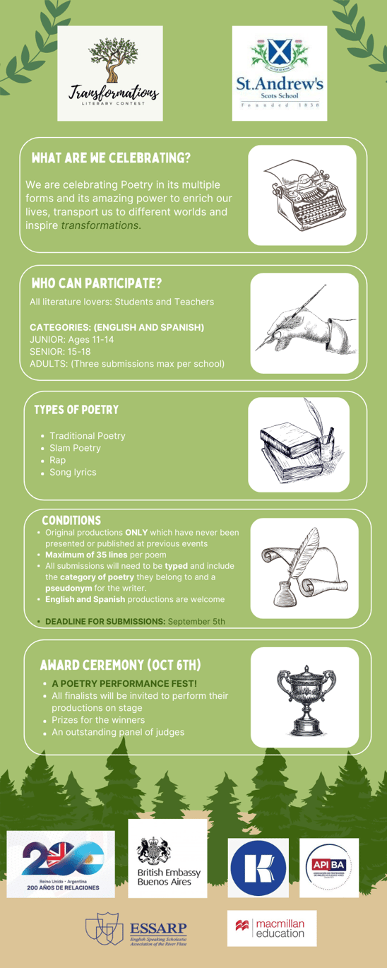 Compartimos la invitación a participar de la primera edición del Literary Contest on Performative Poetry organizado por St. Andrew’s Scots School, en conmemoración de los 200 años de la llegada del Symmetry, barco que trajo el primer grupo de familias escocesas que fundaron el colegio, y de los 200 años de la firma del primer Tratado de amistad, comercio y navegación. Este concurso celebra el intercambio entre Argentina y Gran Bretaña.